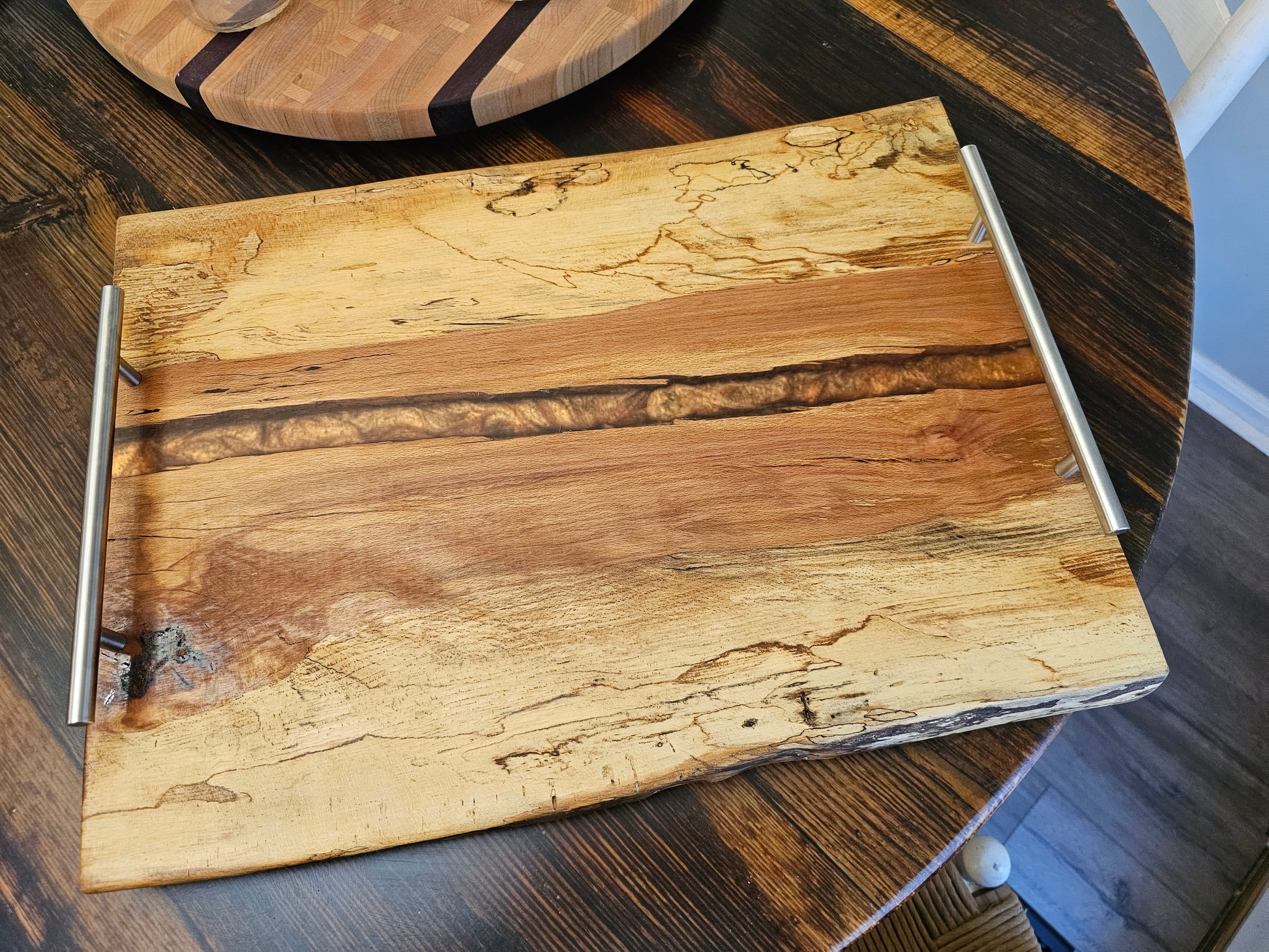 This is an epoxy river charcuterie board made from Beach wood. Measuring 16 X 21.5 X 1 inches, this is a large board that will make a statement and give you room to feed a large group of people at your next event.