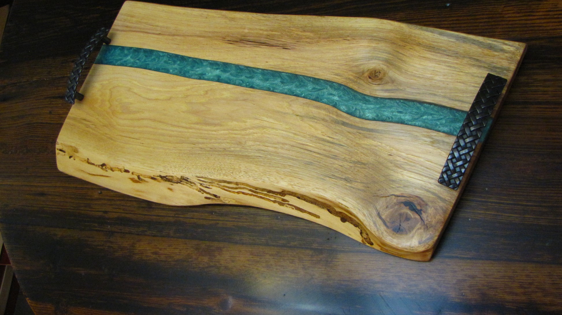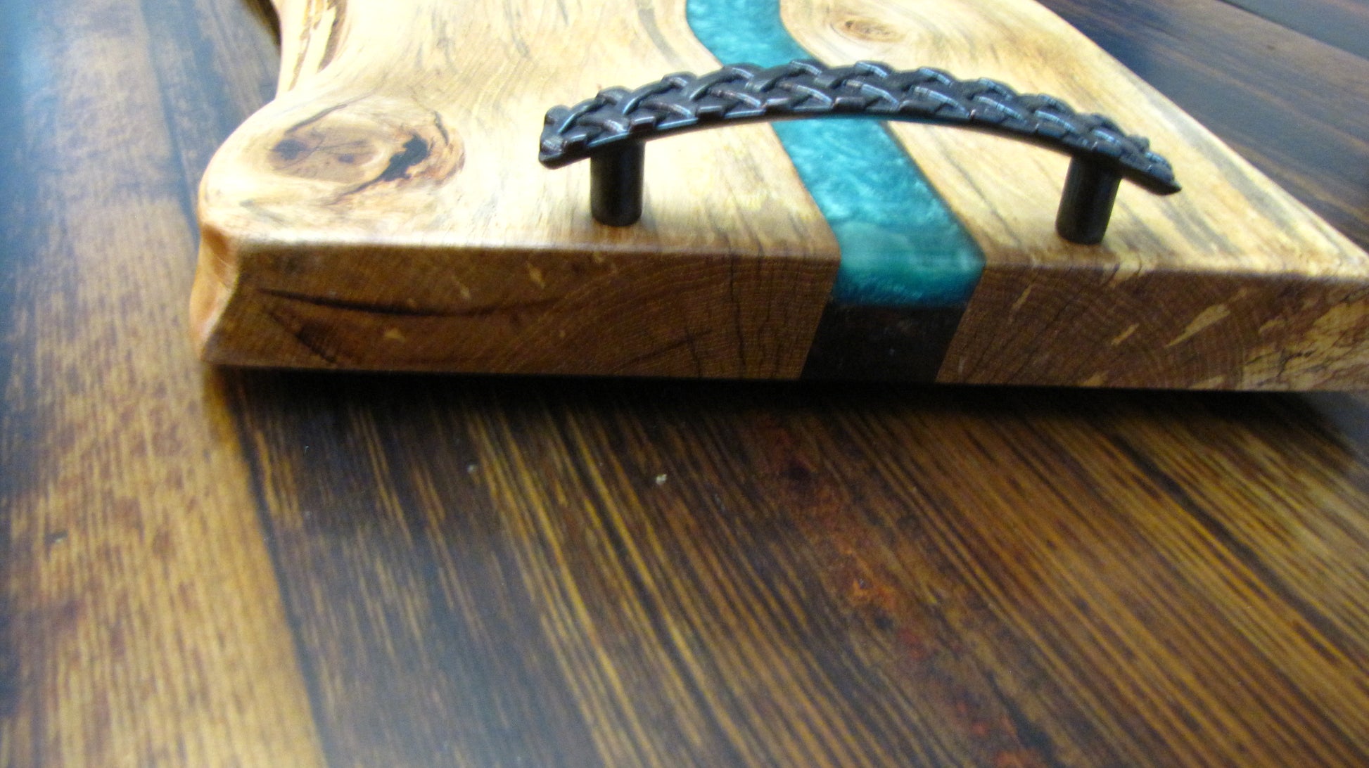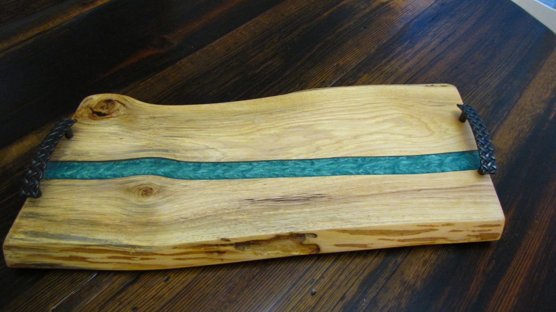 Live Edge Hickory Charcuterie board with green epoxy river. The unique epoxy pattern makes this charcuterie board a focal point of your next entertainment. The board measures 22.5 X 10.5 - 11.5 X 1.25 thick inches with rubber feet and decorative metal braded patterned handles. Custom orders to fit your specific size, wood species, and epoxy colors are always welcome.