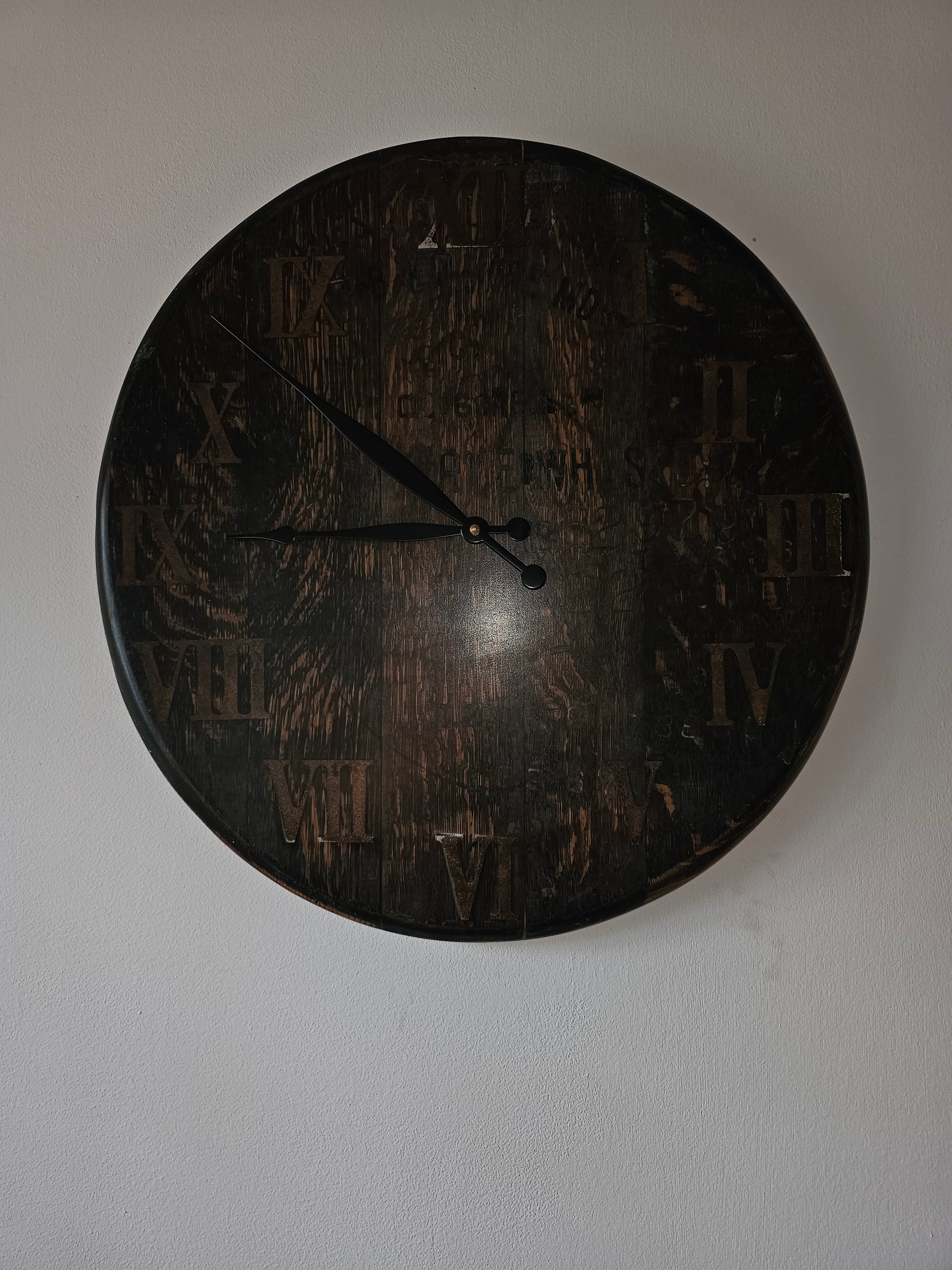 This is one of my favorite clocks, the barrel top is dark and the metal numbers are almost hidden giving it a first appearance of a faceless clock. This is a whiskey barrel lid measuring approximately 19 inches in diameter.