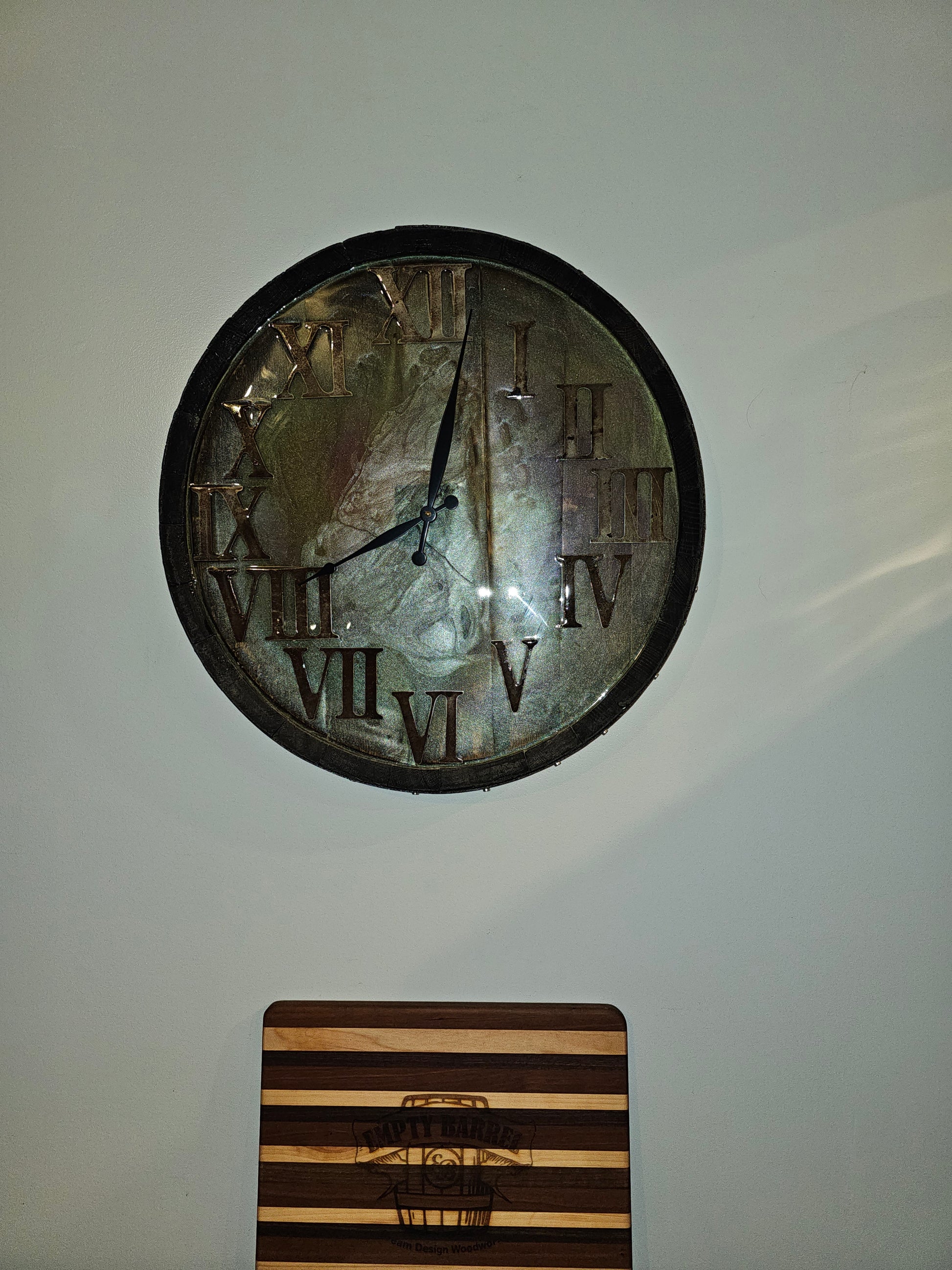 This is an opaque clock made from an old whiskey barrel. The dark aged color of the whiskey barrel creates a very unique clock and one that is truly one of a kind. Approximately 22 inches in diameter with metal roman numerals.
