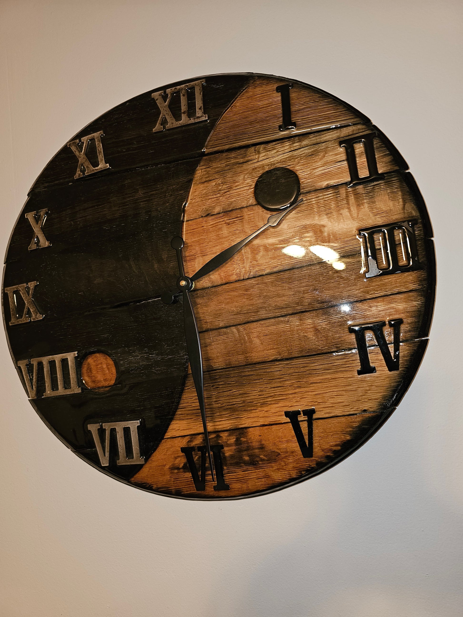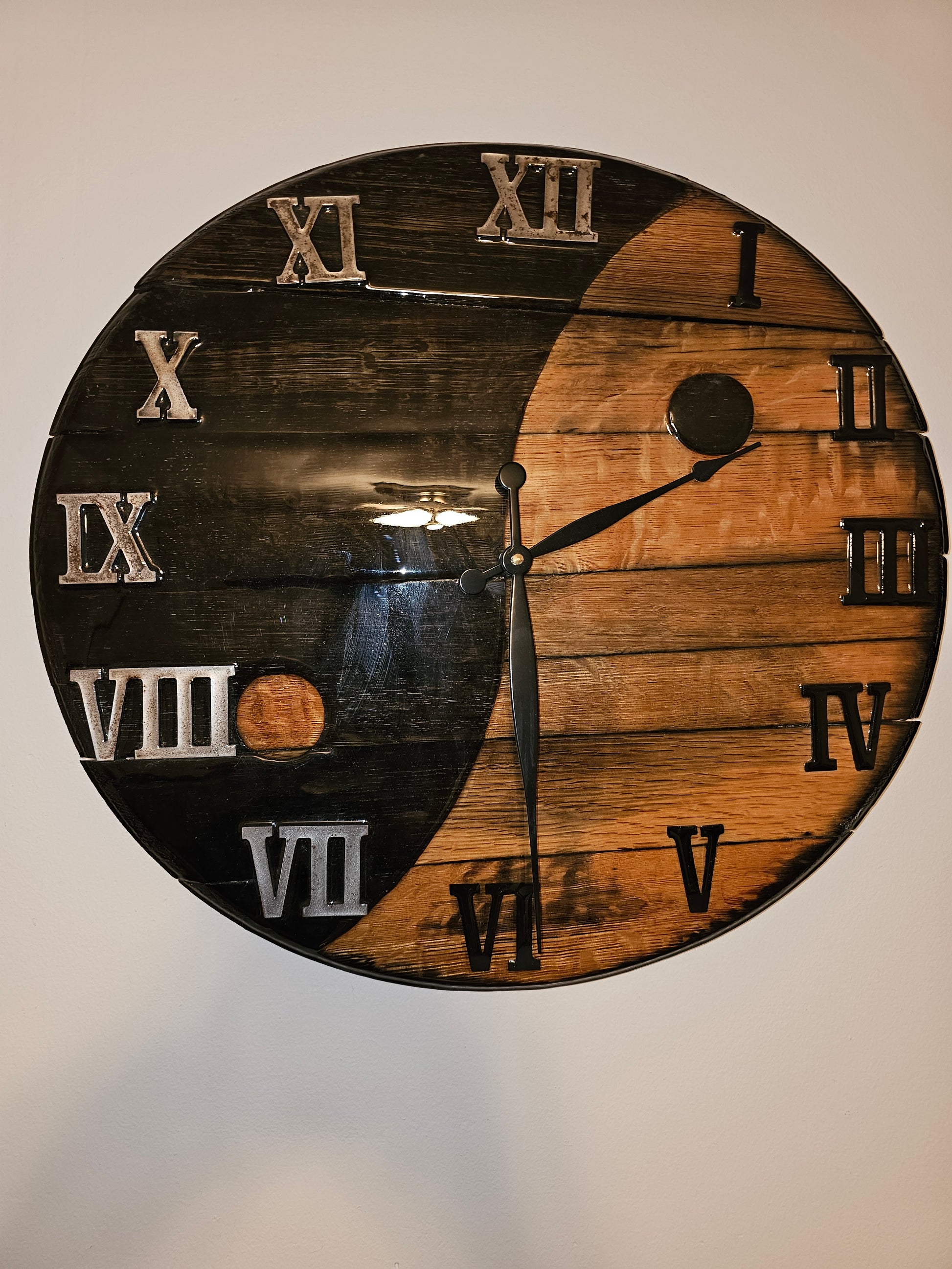 Made from a whiskey barrel top this Yin Yang clock is numbered with metal roman numerals set in an epoxy topcoat.