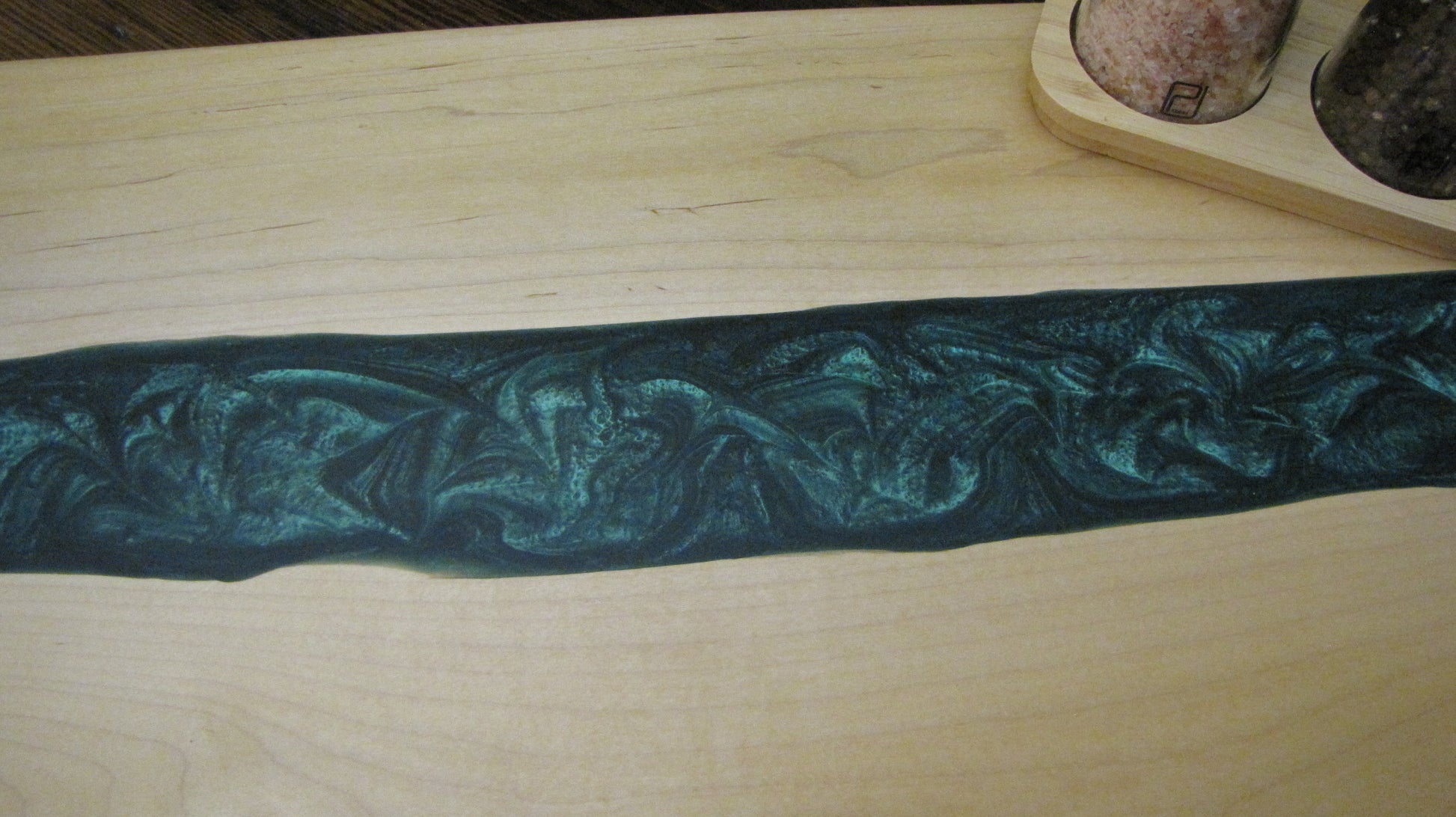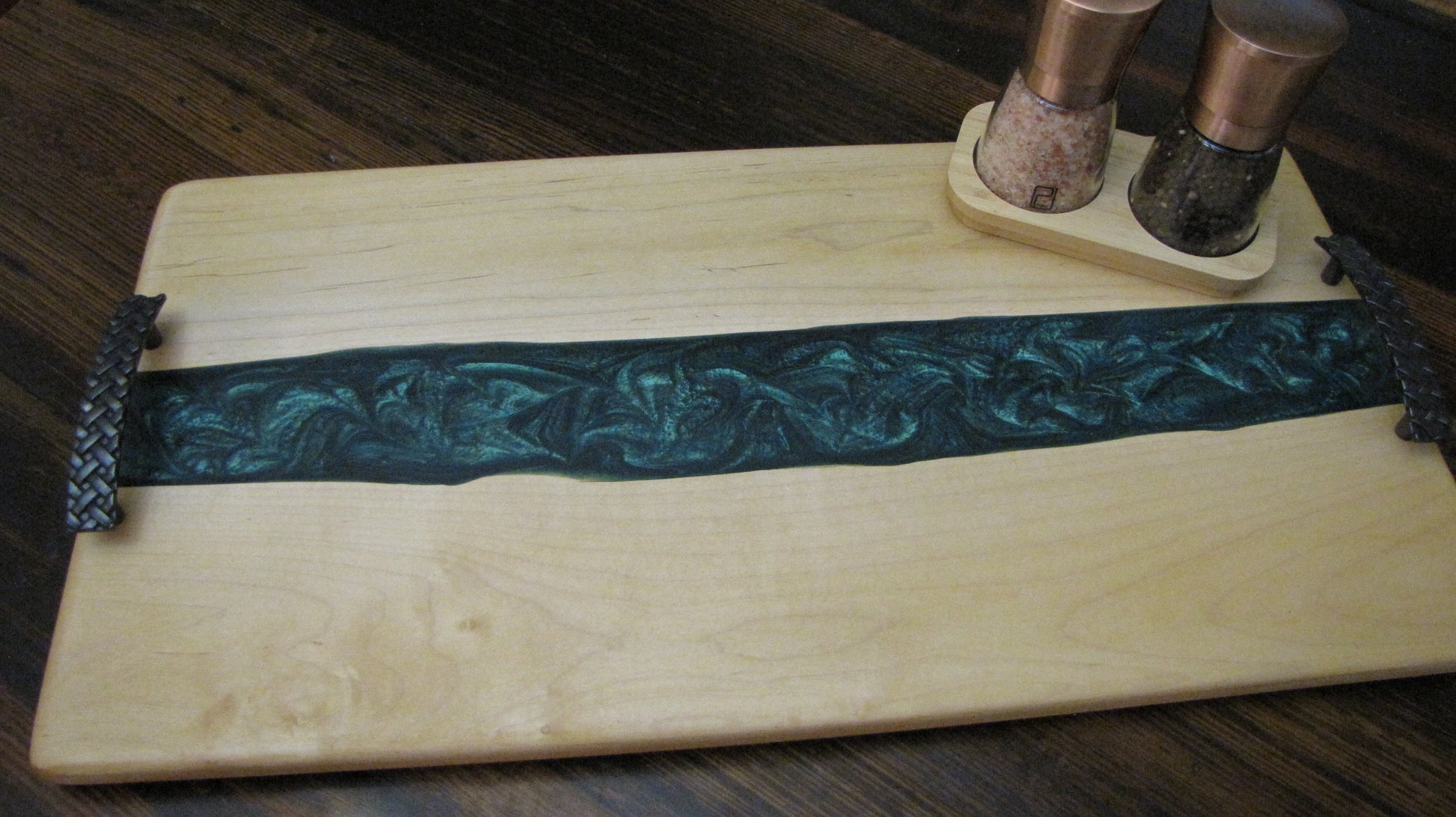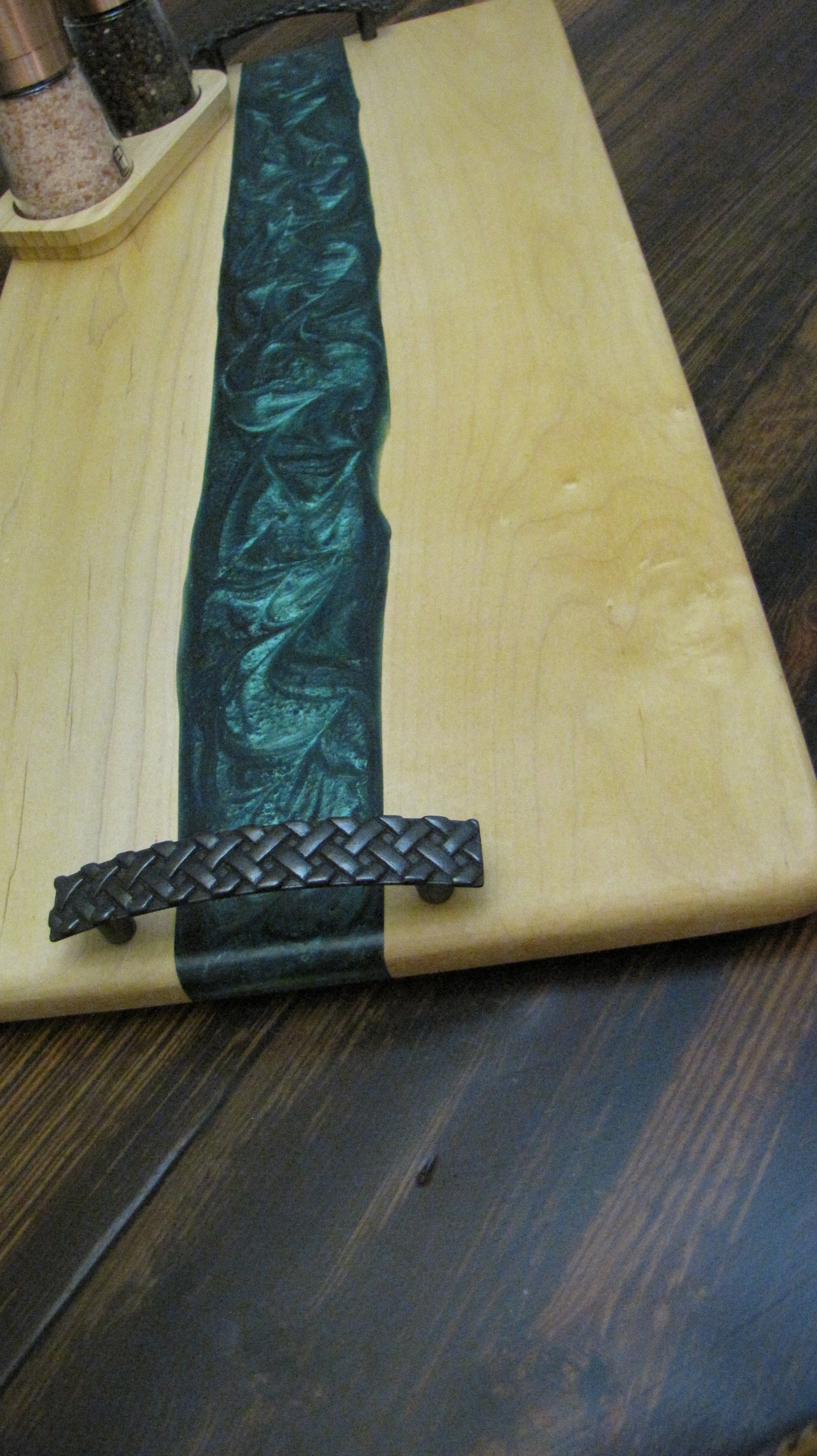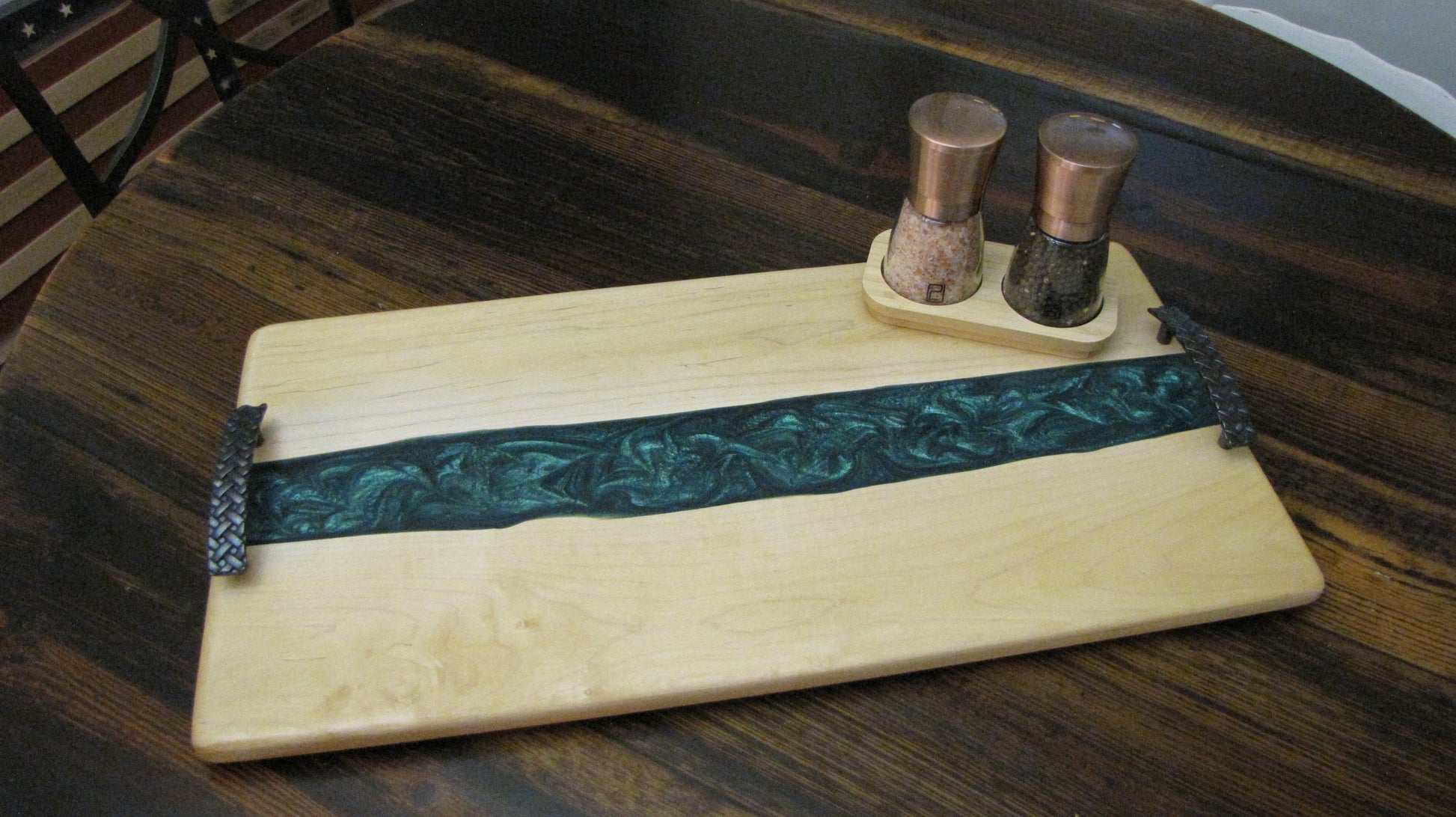 This is a very unique Charcuterie board made with Maple wood. The dark green and silver contrasting epoxy adds a distinct flair that is sure to grab the attention of your guests. Measuring 24.75 X 12.5 inches there is ample room to create a rememberable display, complete with rubber feet and braided patterned handles.