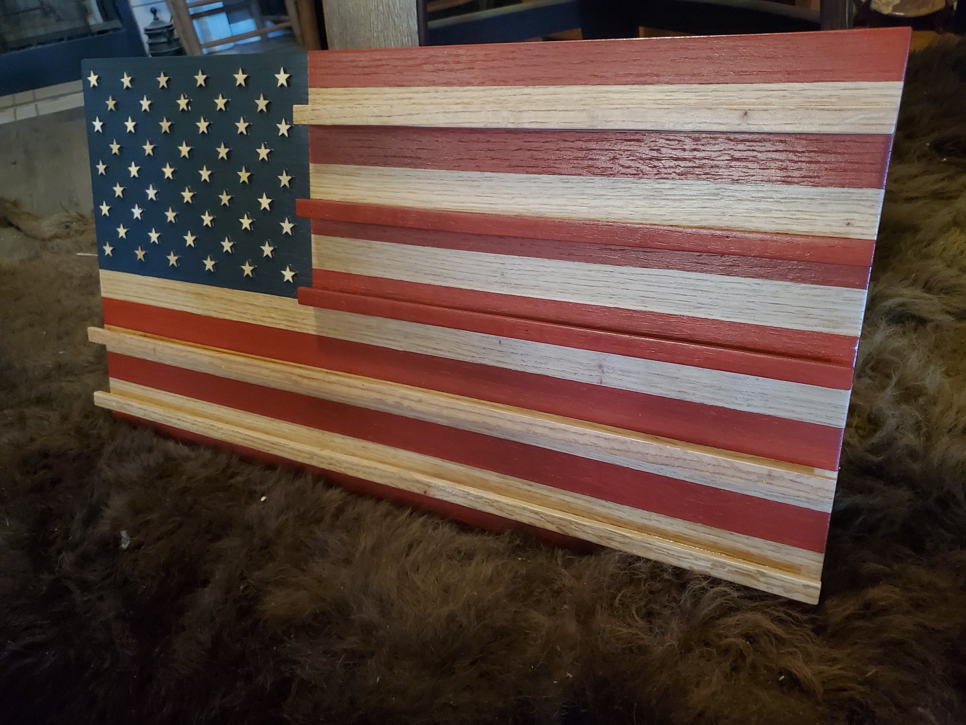 The Flag Coin Holder is designed to attractively display challenge and/or collectable coins while proudly supporting patriotism. Built by a veteran and designed for veterans with pride. The Flag is proportional to the specifications of our great flag measuring 16.25 x 30.85, raised wooden stars and five shelves easily displaying over 50 military coins. Solid Maple construction makes this the perfect gift that will last for generations.