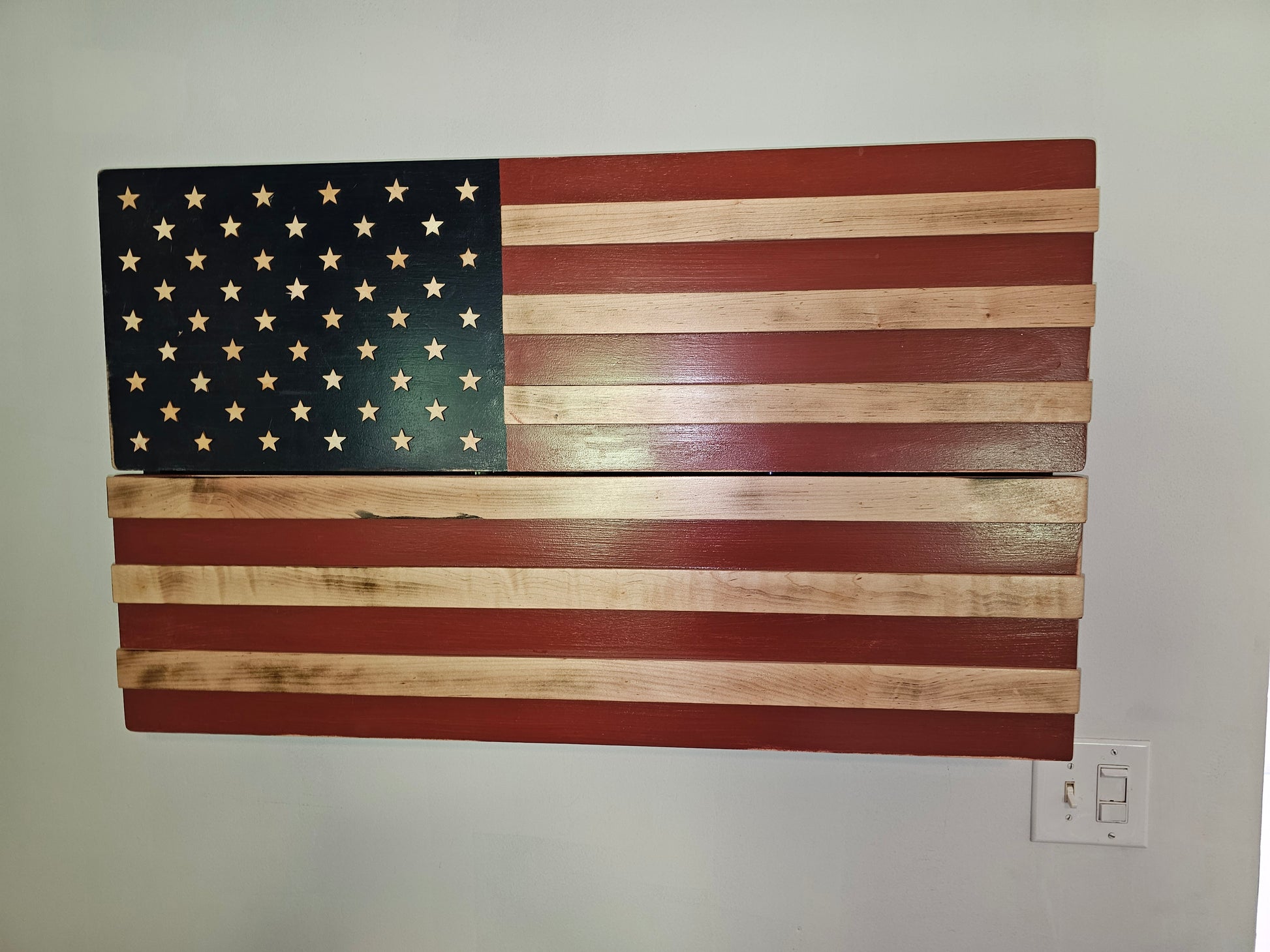 A fun option to the gun flag is the "His and Hers" Bar Flag. The flag opens to access two compartments with an added cylinder to the bottom door so that it can support your drinks and serve as a prepping area. Wine Glasses, whiskey glasses and a decanter can be added as an additional option. These flags are made of hard wood, no pine construction,