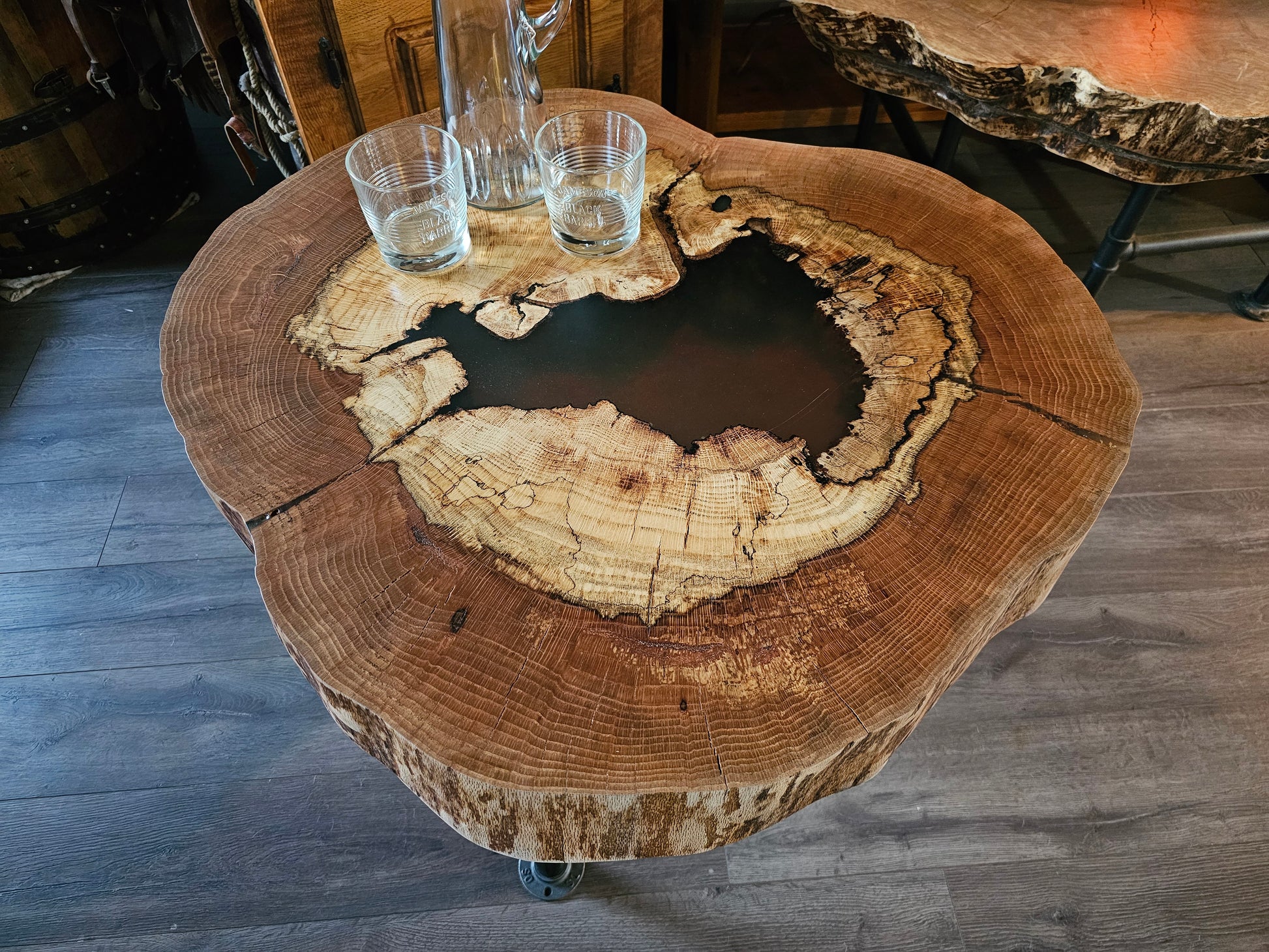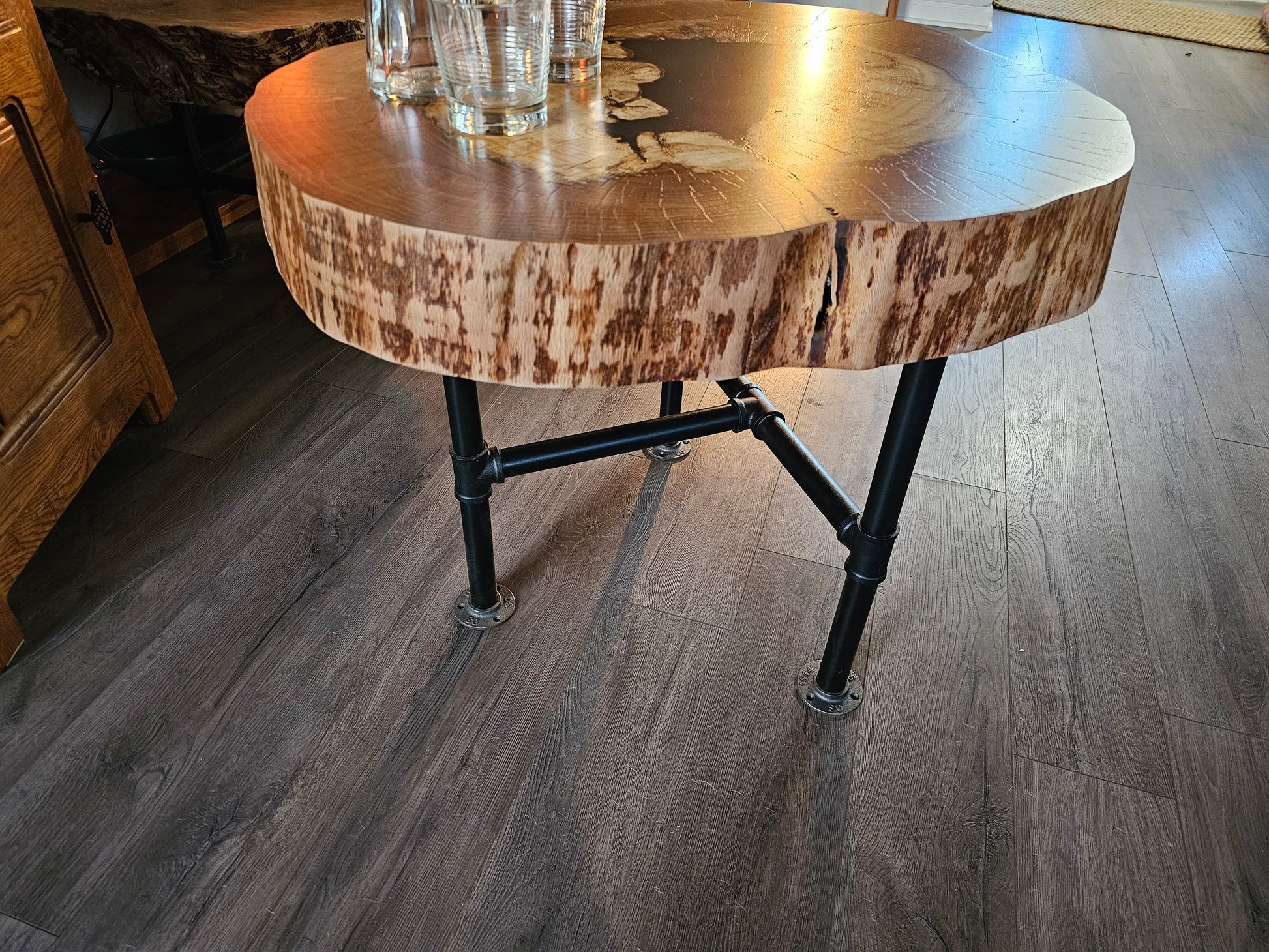 This hollow table makes a statement while functioning as a sturdy end table or coffee table. The epoxy fills the center void with a degree of transparency to create a truly unique piece. Measuring 23.5 inches tall and 21" to 29" in diameter. The top is 3.75 inches thick with 1 inch industrial pipe legs.