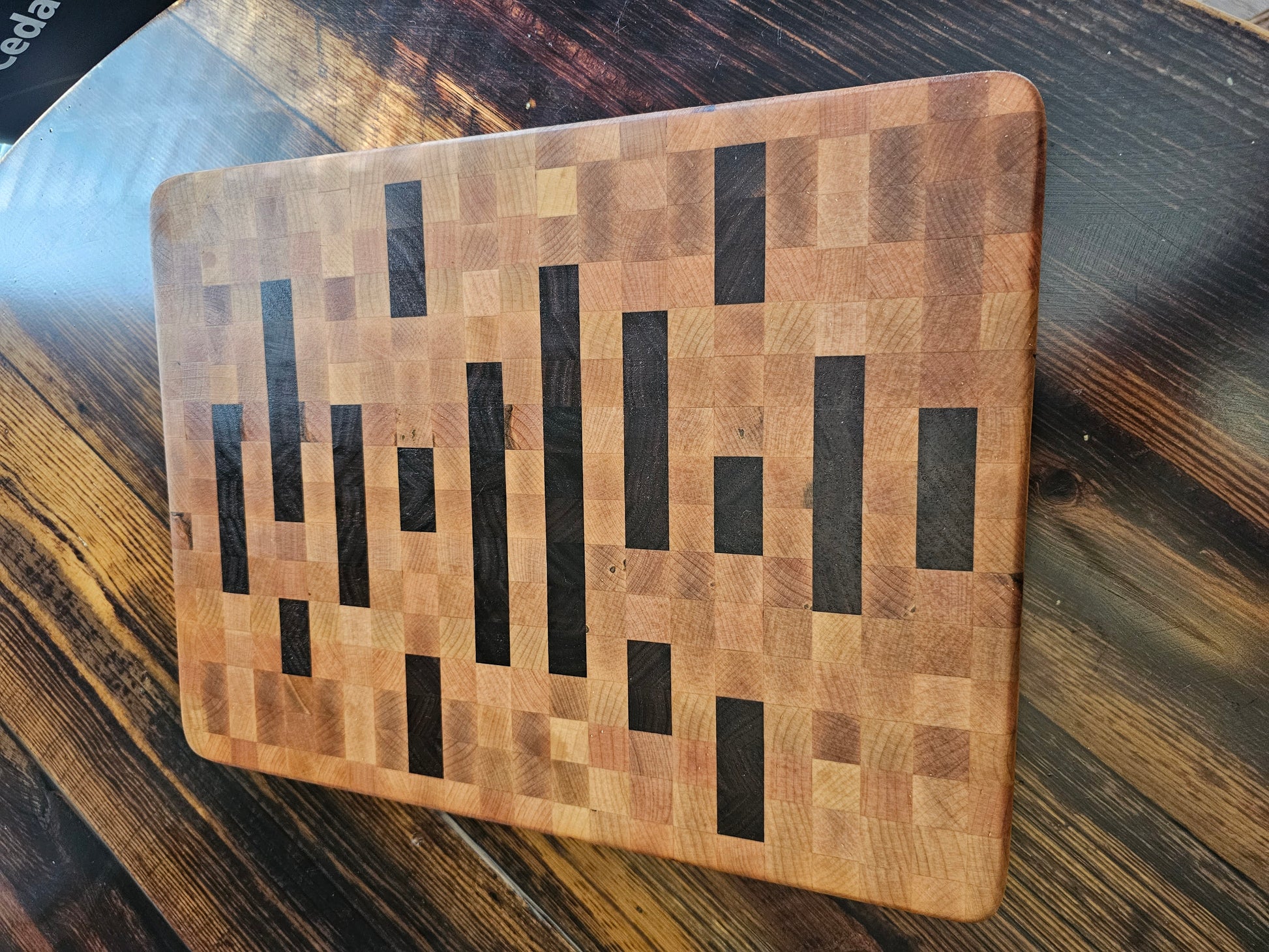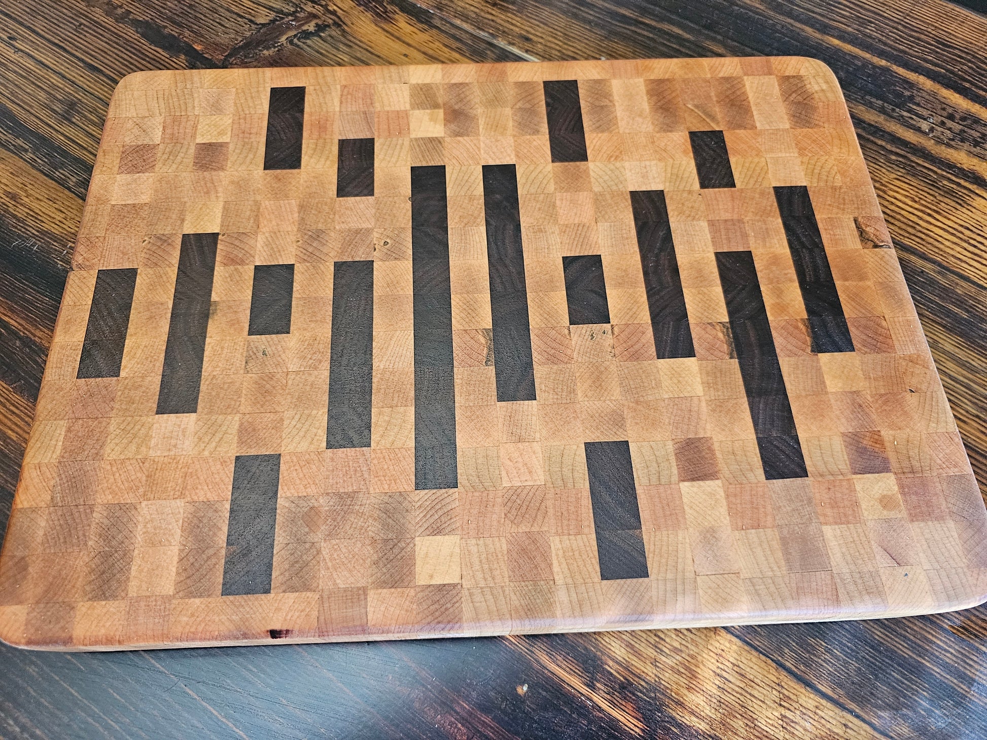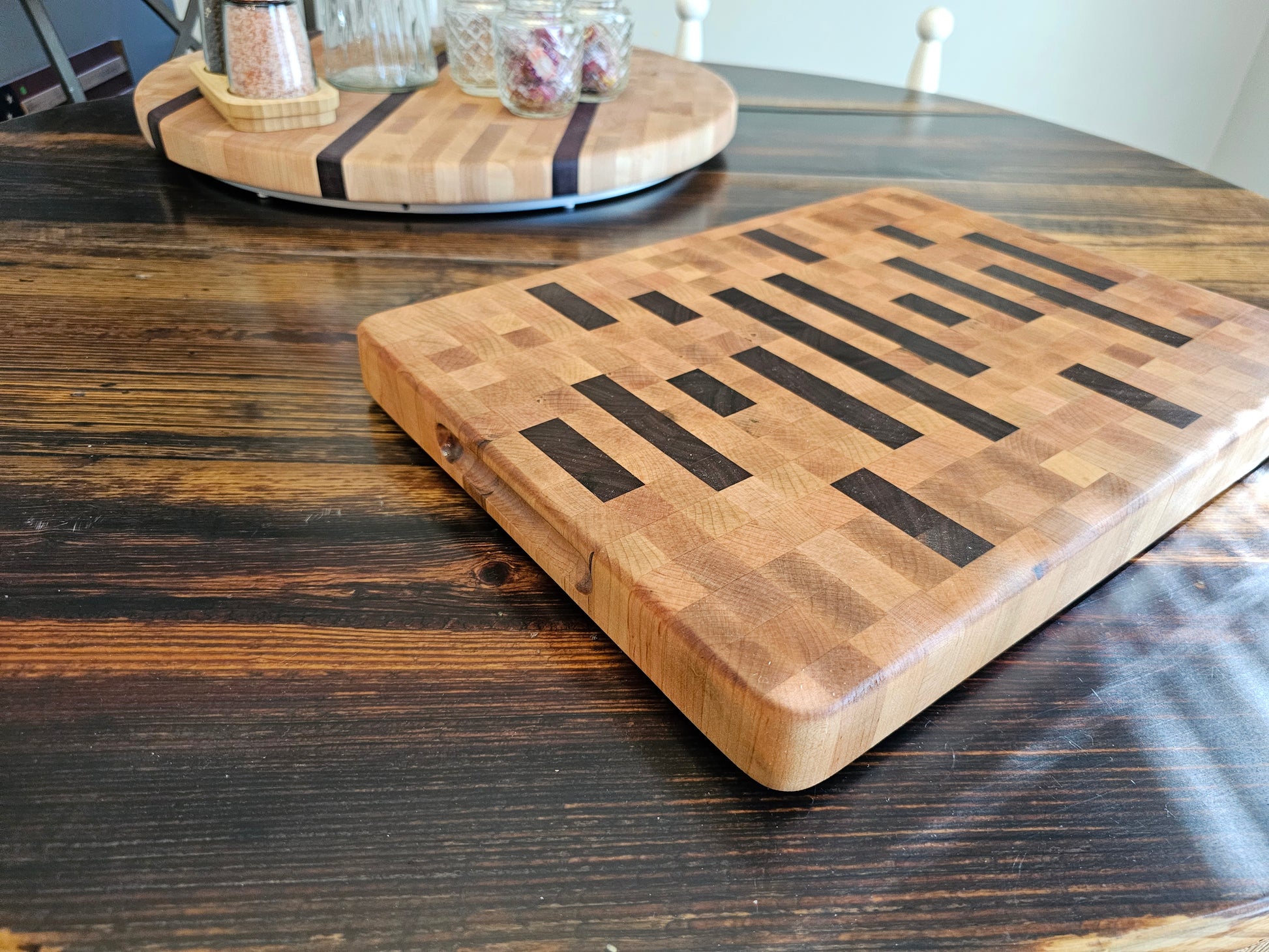 Maple with accents of Walnut make this 16.5 X 12.5 X 1.5 inch End Grain Butcher Block. This is a fun pattern with intentional strips of walnut that set this apart.