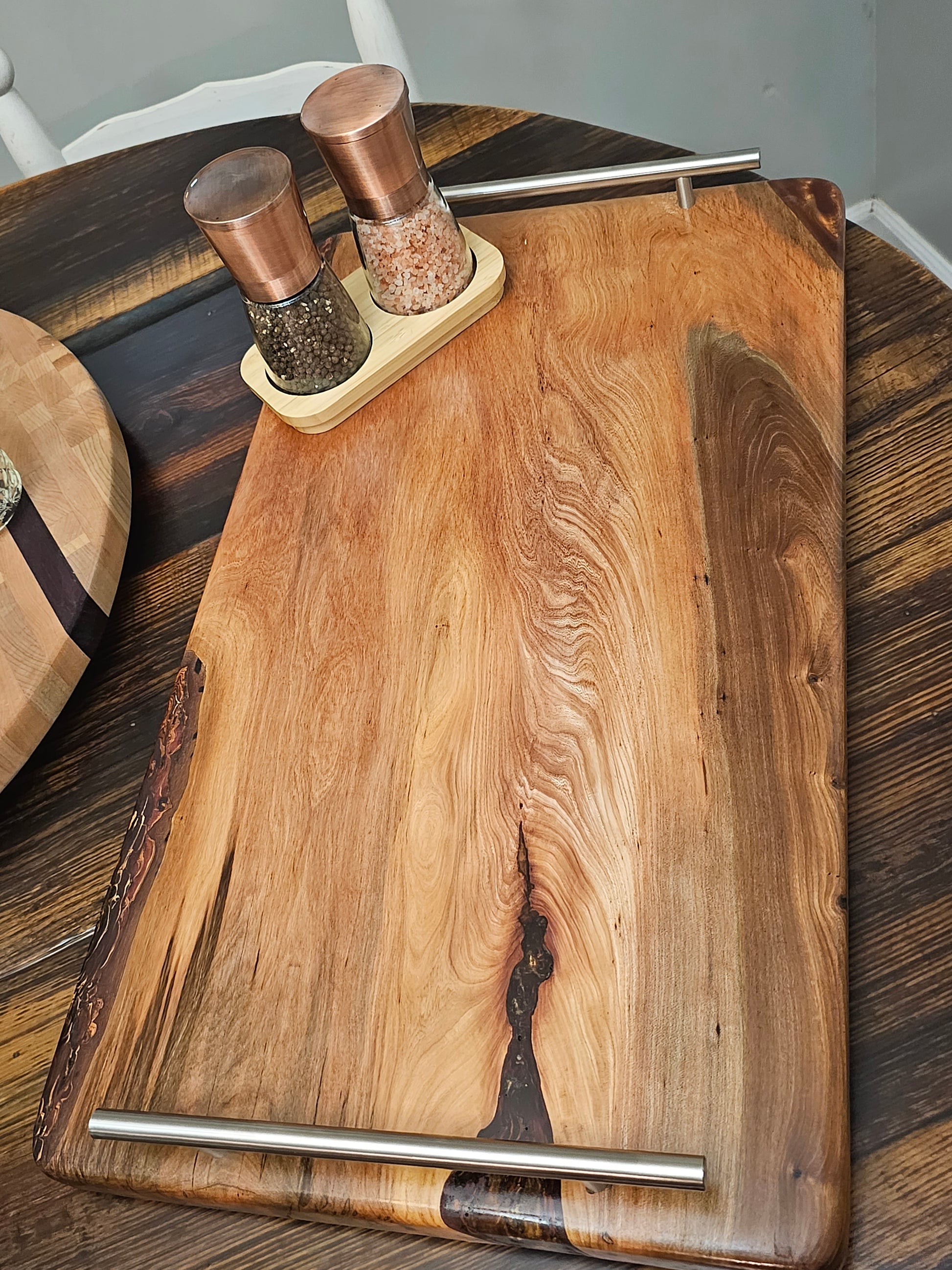 Red Elm has a beautiful distinct grain that will dray attention. This board is 24 X 14 X 1 with rubber feet and stainless handles. There is a small amount of epoxy to square the board and fill any voids. Ready to display for your next event.