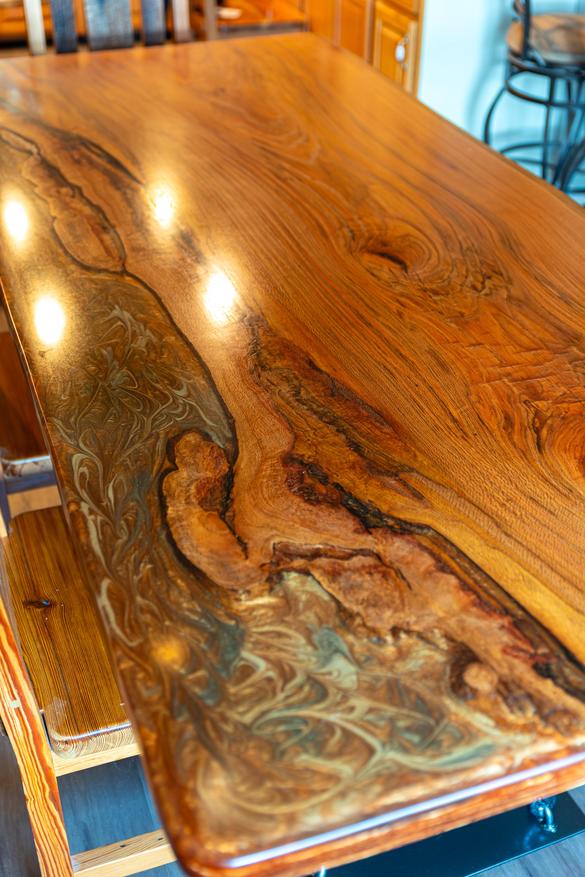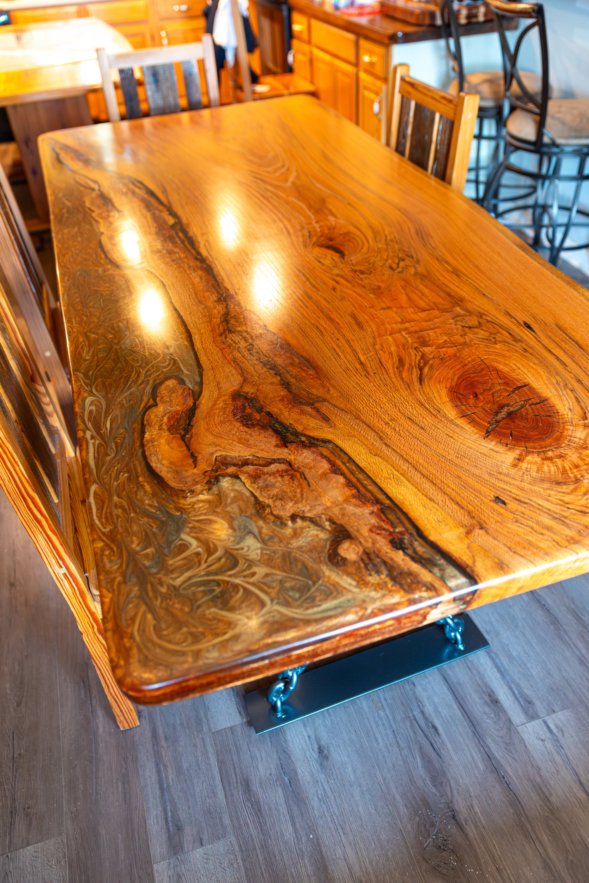Here is a table that demands respect, at almost 2 inches thick and one solid piece, from bark to bark, this is a showcase table. The epoxy is poured on the exterior of the table to build consistency and preserve the tree's natural movement. This table is just under 8 feet in length and approximately 41 inches in width. I built custom legs from 7/8 chain and powder coated them to ensure the quality of this piece matches the uniqueness that truly embraces a one-of-a-kind piece.