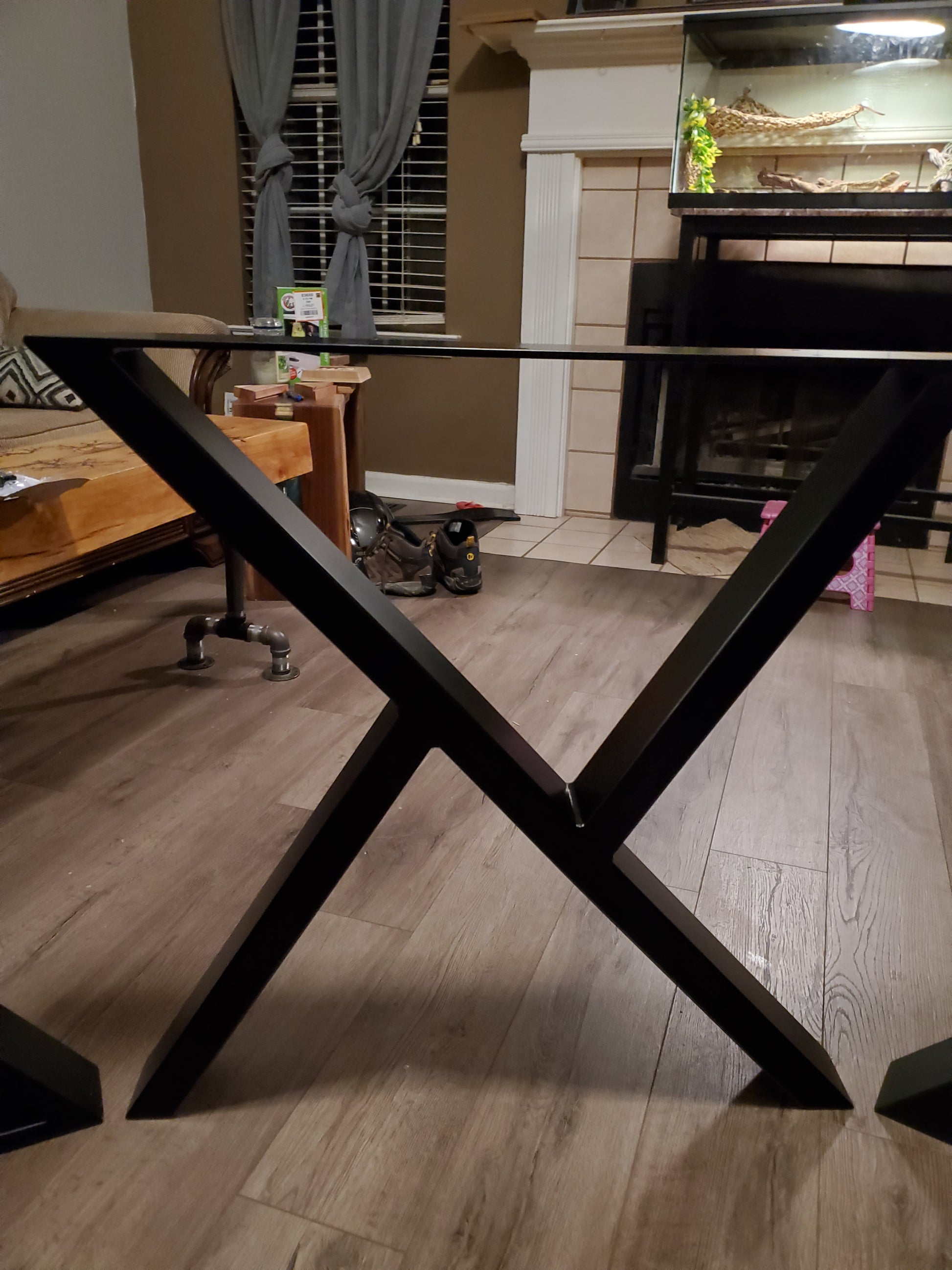 This is a sleek table leg that is supportive and decorative. Steel construction and powder coated in a variety of colors.