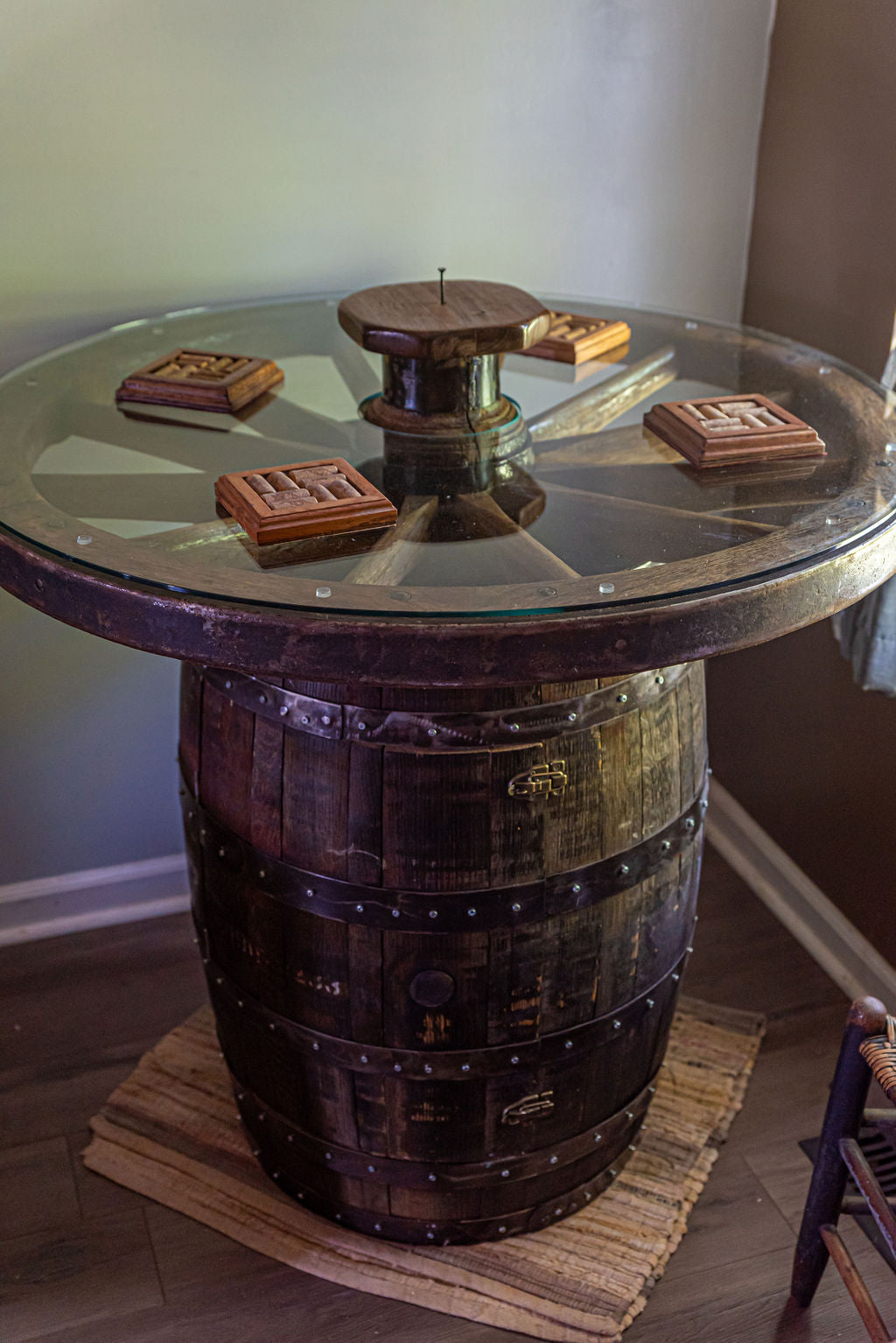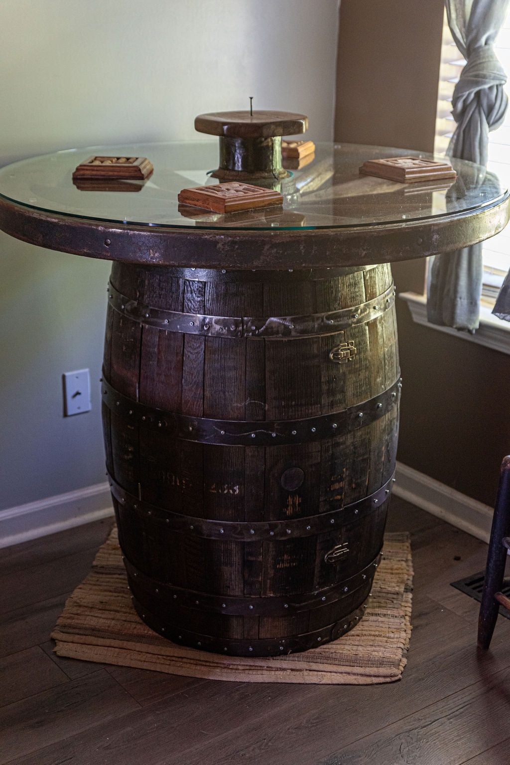 Authentic 42 inch wagon wheel set into a whiskey barrel. The door accesses the lazy susan that turns to display and conveniently store your goods. The 1⁄4 inch glass top makes a comfortable table or bar with visibility of the authenticity and character of the wagon wheel and whiskey barrel.