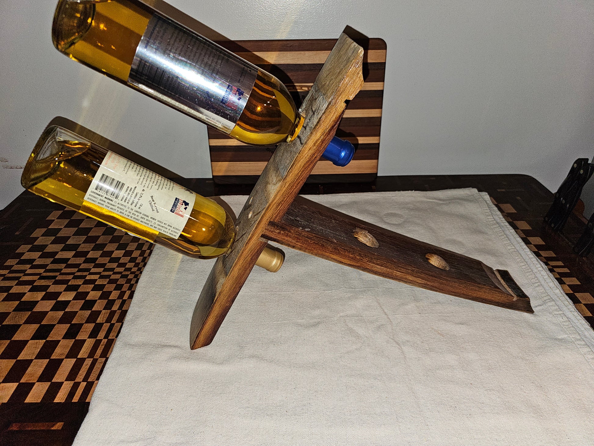 Counter top/tabletop wine or liquor display made from whiskey barrel staves. These vary with the different staves making each piece unique.